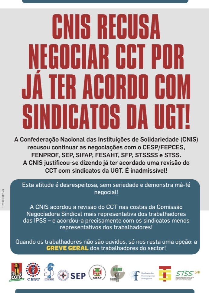 A Confederação Nacional das Instituições de Solidariedade (CNIS) recusou continuar as negociações com o CESP/FEPCES, FENPROF, SEP, SIFAP, FESAHT, SFP, STSSSS e STSS.